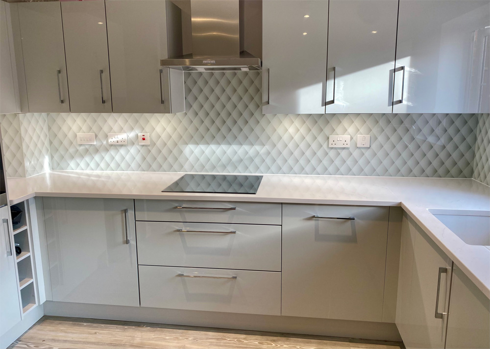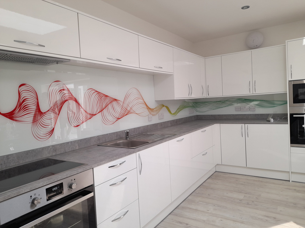 We fit toughened glass splashbacks. Toughened glass is heat, scratch and impact resistant. This makes it ideal to be fitted near hot areas such as gas hobs, and in busy kitchens where the walls may get bumped & bashed.
